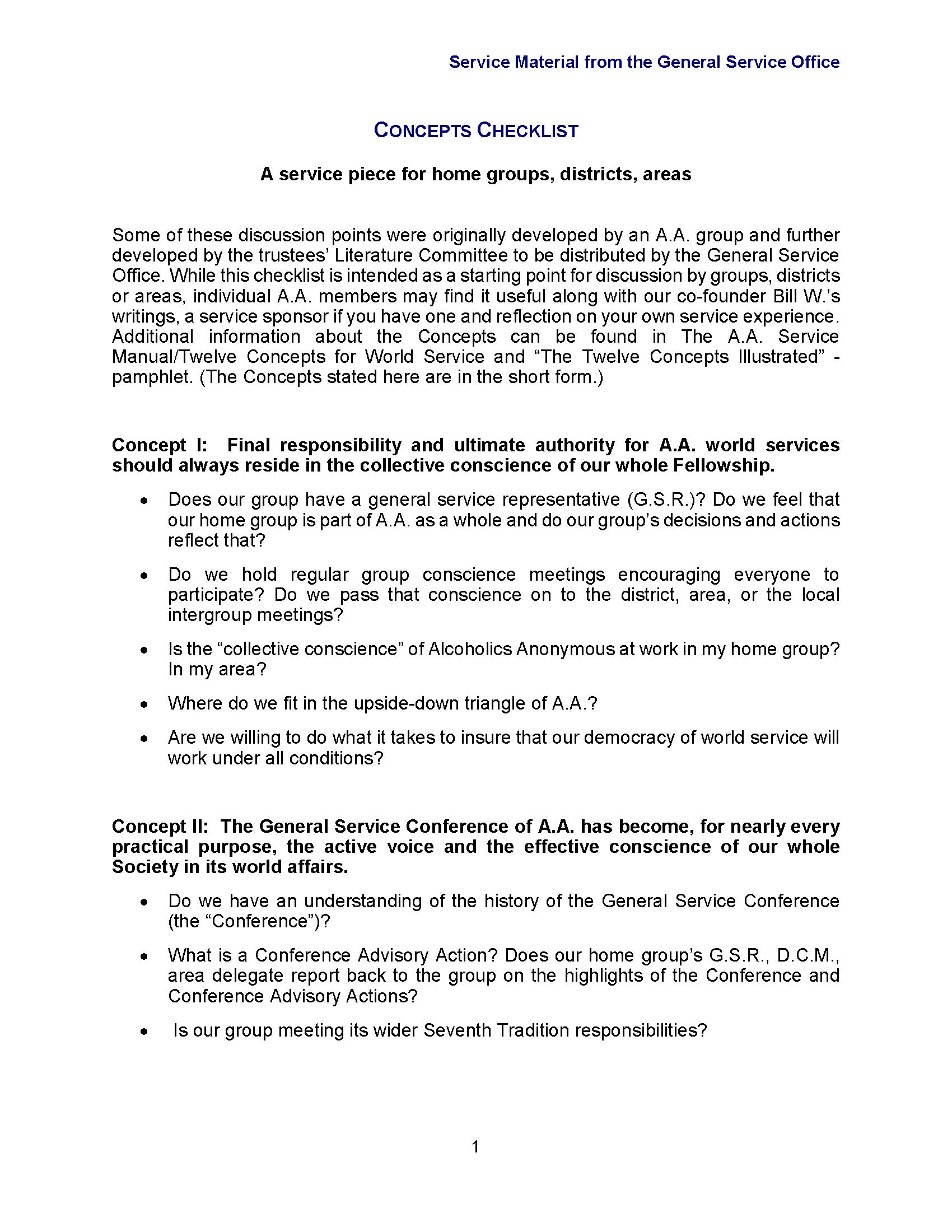 Intended as a starting point for discussion, this service piece offers questions related to each of the Twelve Concepts so that members may develop a deeper understanding of the Concepts and better assess to what degree their group, district or area is aligned with them.