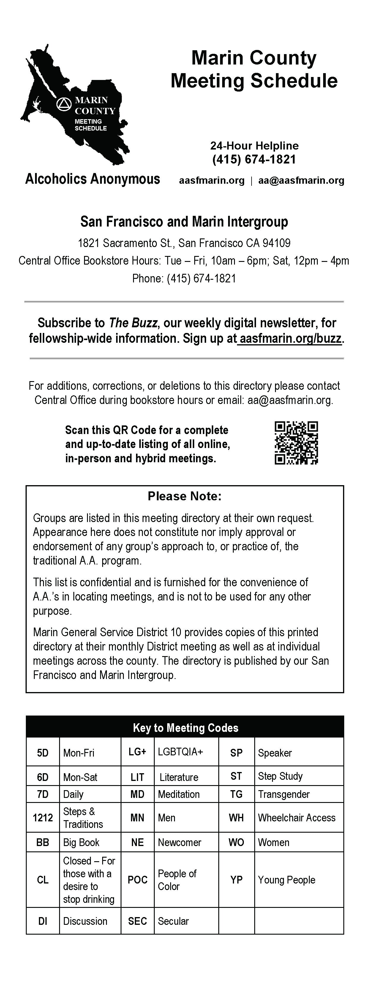 The printed schedule is for in-person meetings only; it does have a QR code on the front page that takes readers on smart phones to the online meeting finder for both in-person and virtual groups. These schedules are updated quarterly and printed on quarter-folded 11x17 colored paper.