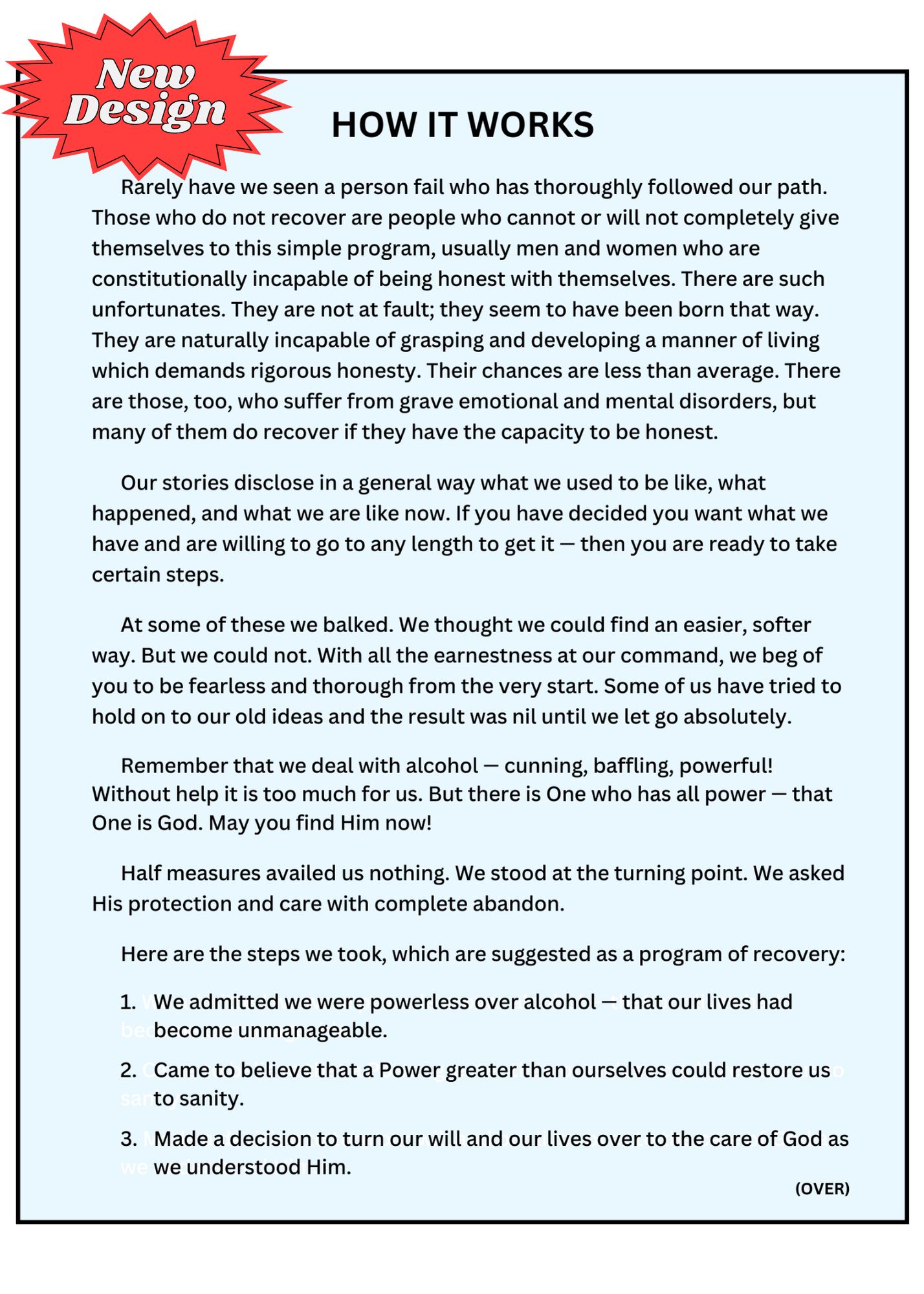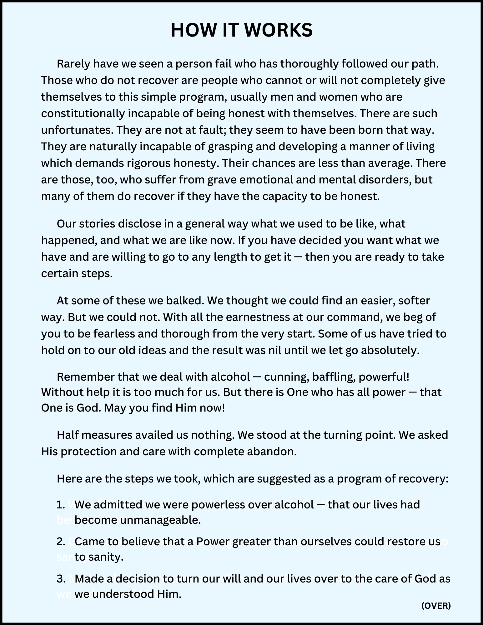 Containing the most commonly read literature excerpts used to open and close A.A. meetings, these sheets are laminated and 3-hole punched for storage in a binder. New redesigned in large print for greater reading accessibility.