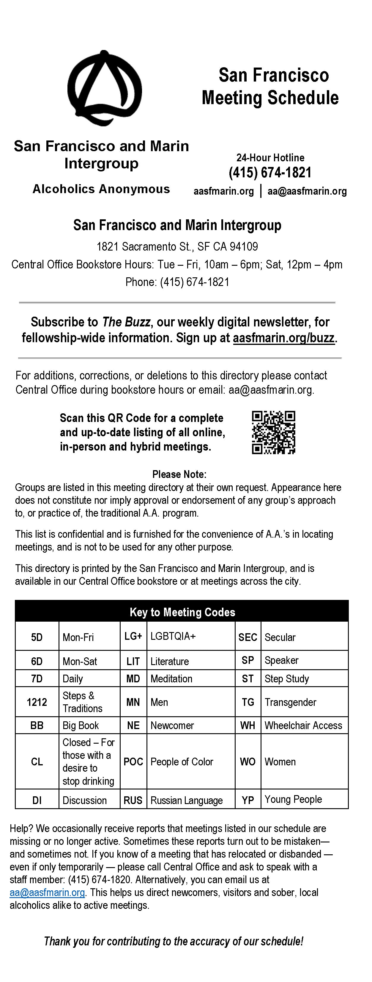 The printed schedule is for in-person meetings only; it does have a QR code on the front page that takes readers on smart phones to the online meeting finder for both in-person and virtual groups. These schedules are updated quarterly and printed on quarter-folded 11x17 colored paper.