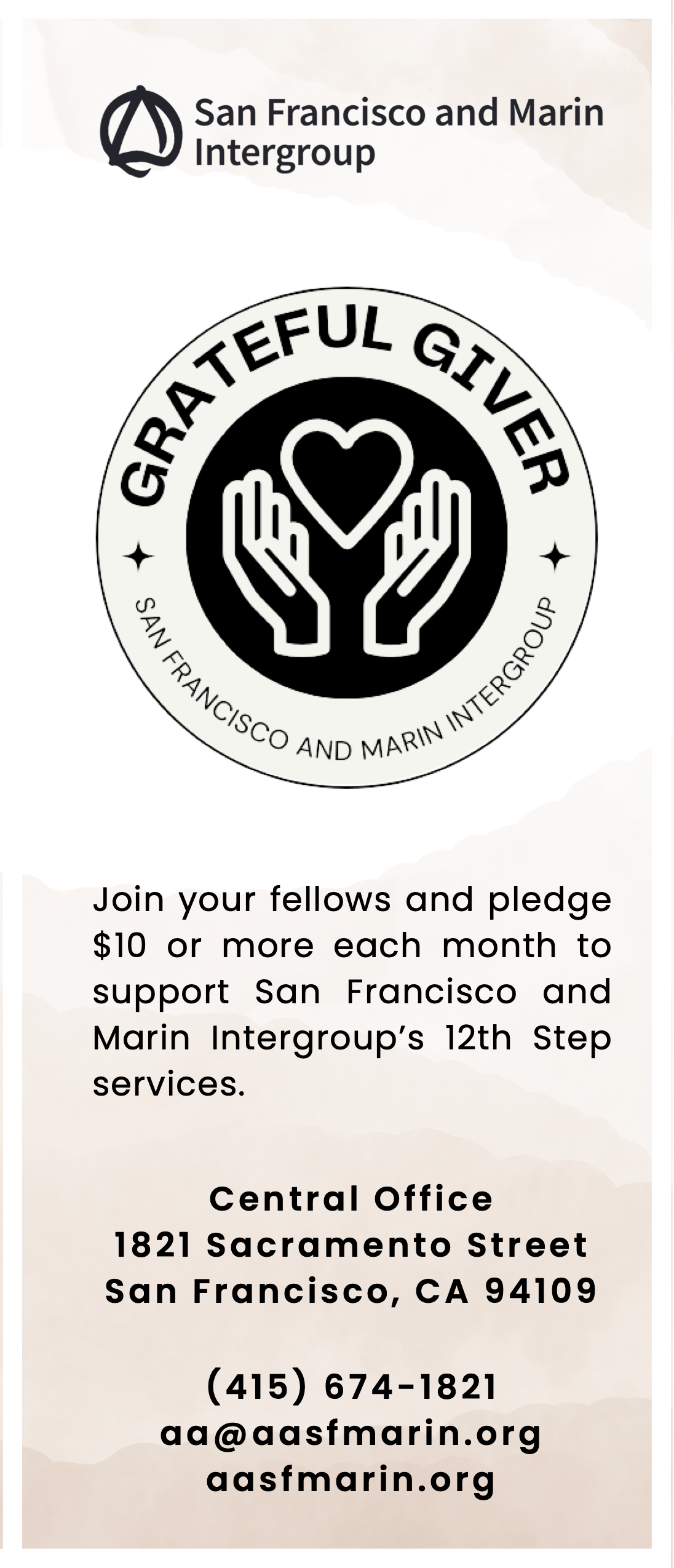 San Francisco and Marin Intergroup’s Grateful Giver program is a form of 7th Tradition self-support by individual members, made on a recurring monthly basis. Members contribute $10 or more each month to help support the 12th Step work of the San Francisco and Marin Intergroup.